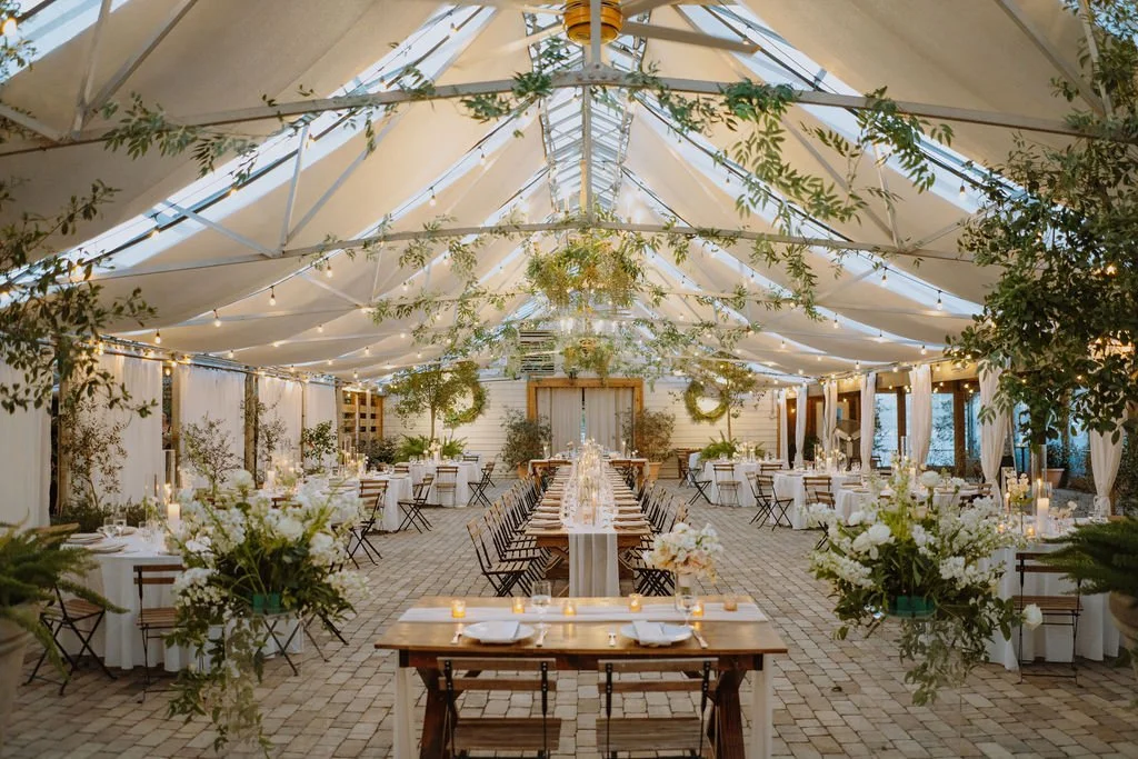 Name a season, any season, and our interiors will be as lush and fresh in January as they are in July. Two parallel Greenhouses offer amply space off a foyer that houses a bar with cocktail hours and wine tastings. Our spaces are lavish and alive with potted plants, twinkling lights, romantic drapes, and chandeliers. The entire interior easily traditions to cozy heated spaces for chilly Fall and Winter weddings.